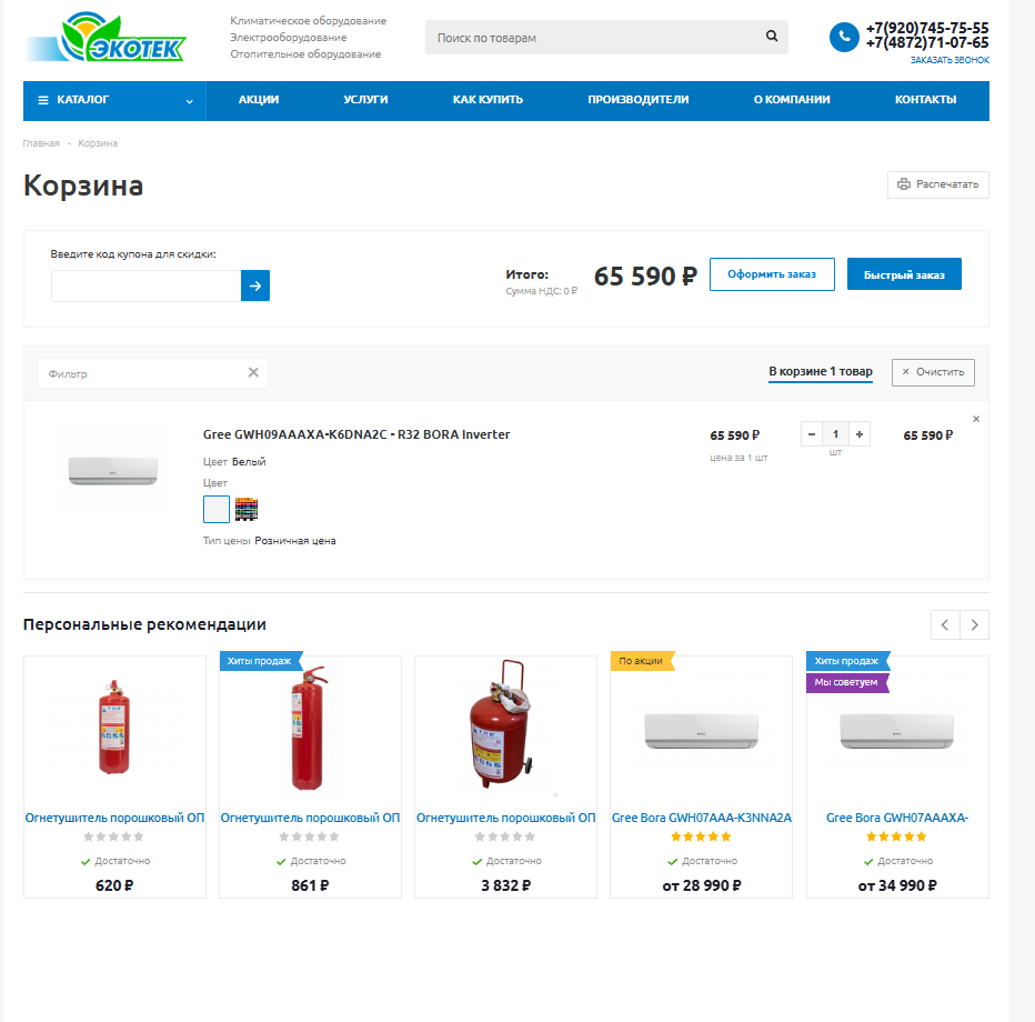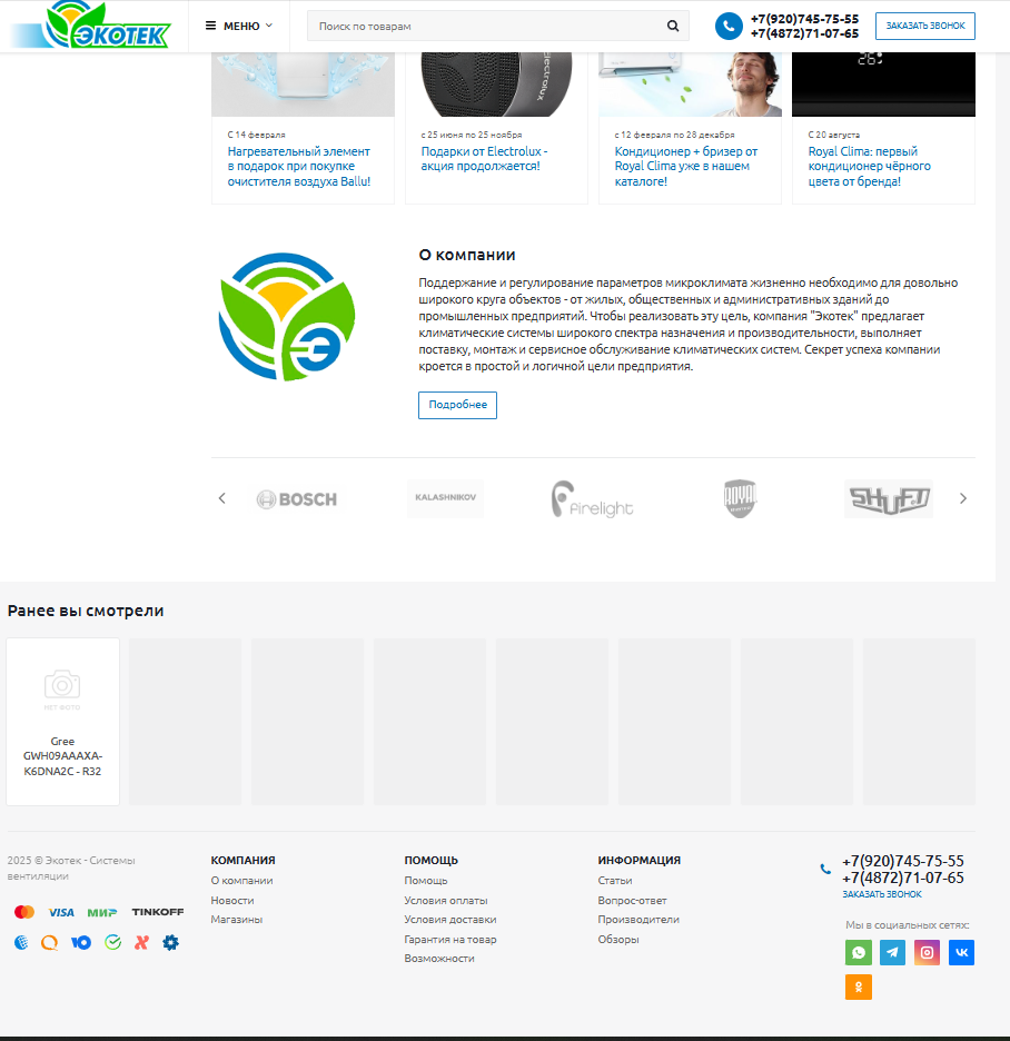 Сайт для компании ООО "Экотек" представляет интернет-магазин с качественно проработанными детальными страницами товаров, на которых выведены основные информация и характеристики товара, приведены технические сведения о продукции.